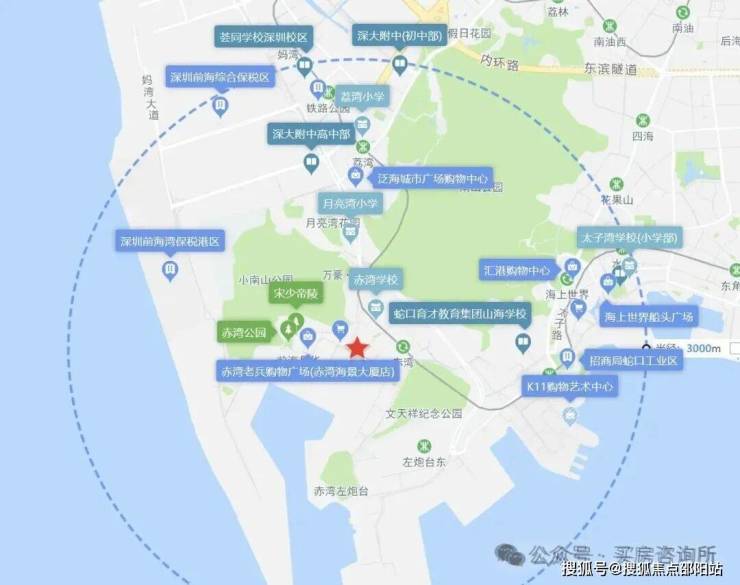 地块周边教育、商业配套,医疗配套有待提升,3km范围内有赤湾学校、月亮湾小学、太子湾学校、深大附中、K11购物艺术中心、海上世界船头广场、嘉盛荟商业中心、泛海城市广场等。