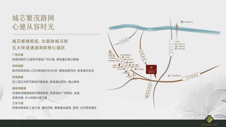 区域介绍项目位于海珠城心,周围拥有强大的交通网络。毗邻工业大道、南洲路、广州大道等多个重要交通干道,便捷通达全城。项目地处广州城市中轴地带,享有优质的教育资源和医疗配套。特别是项目旁边的广州五中教育集团领办的24班小学,确保了孩子的优质教育起跑线。