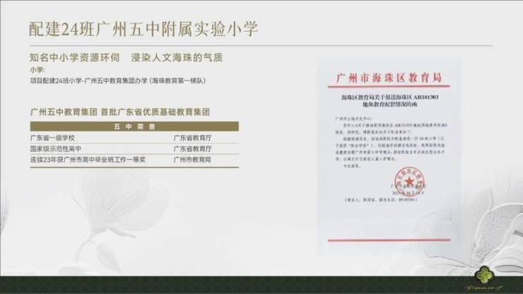项目自带24班配建学校,计划引入广州五中教育集团办学,成为五中集团旗下唯一小学。周边还有广州五中东晓学校、九十七中学金碧校区等省一级学校。
