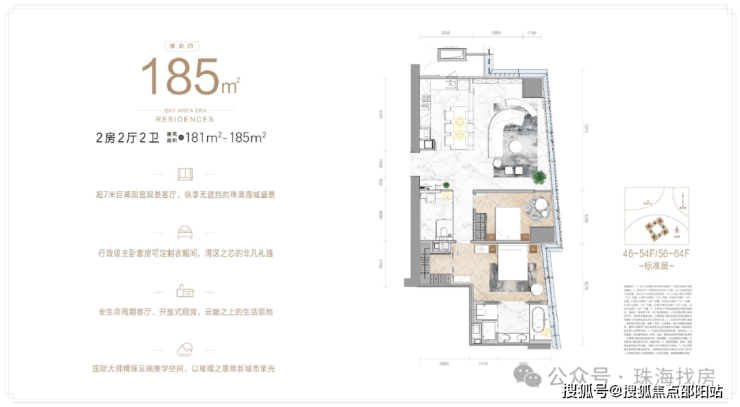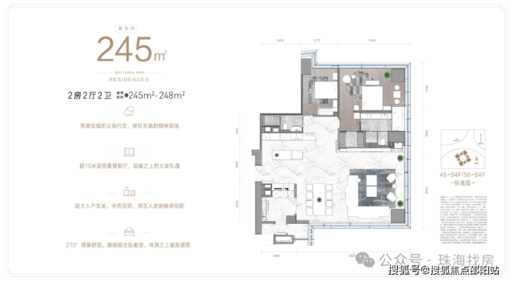 🔴46 层到 68 层是 70 年产权的领空权揽澳住宅(约3.8万㎡) ;