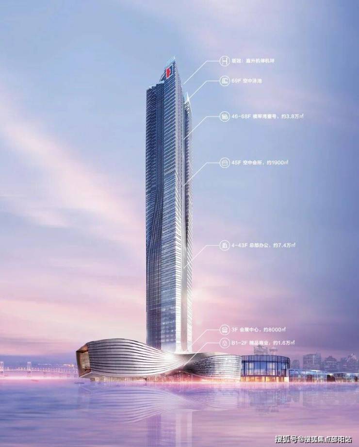 IFC横琴国际金融中心:建筑高度339米,是珠澳第一高楼。华发集团连袂凯达环球Aedas以“乘风驭势,蛟龙出海”为理念,寓意着新生力量磅礴跃起。占地面积约2.3万㎡,总建筑面积约20万㎡,集甲级写字楼、高端住宅、高端商业、会展中心、空中会所等多元高端业态,共69层,其中: