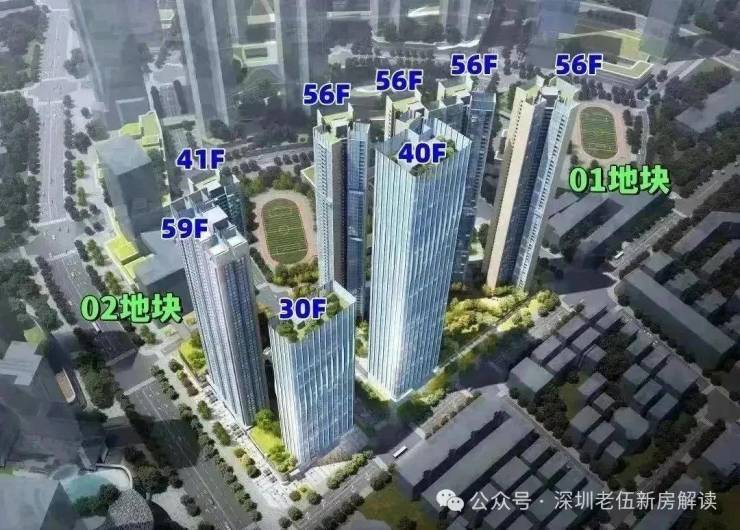 01-02地块占地约1.23万平方米,总建筑面积约15.08万平方米,计容建筑面积约10.85万平方米,容积率为8.31,绿化率为40.01%。该地块包含2栋住宅楼,分别为41层和59层,以及1栋30层的办公楼和1所9班制幼儿园。总规划1194户,住宅楼采用3梯4户设计,其中包括972套保障房。