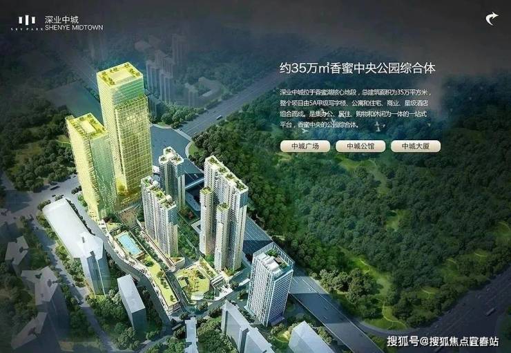 深业中城位于福田区红荔西路与农园路交汇处,占地近4万㎡,总建筑面积约36万㎡,容积率6.62,毗邻约42.4万㎡的香蜜公园,将打造成为集商业、酒店、办公、公寓、住宅等物业类型为一体的城市公园综合体。