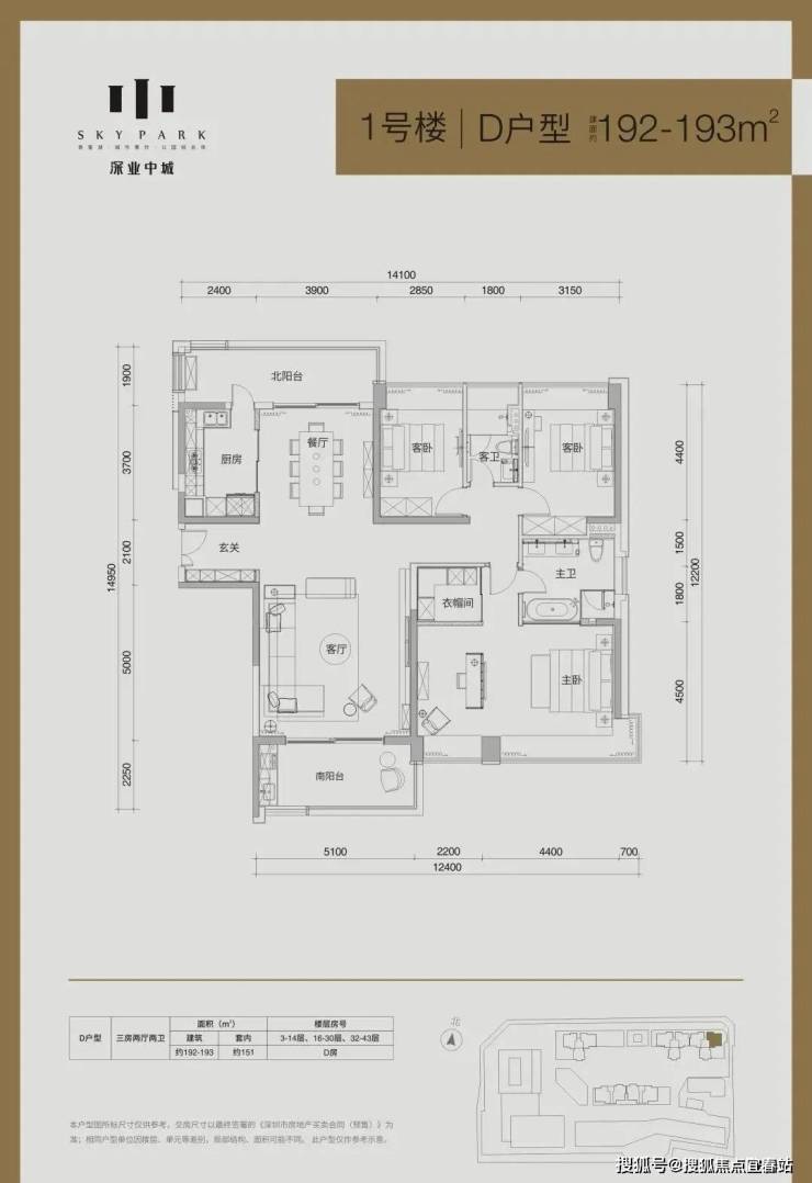 住宅共有三栋,2/3栋为28-29层,合计192套住宅;1栋为43层,共222套。