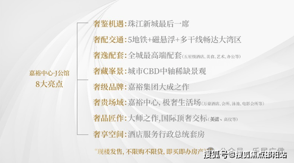 开发公司:嘉裕集团嘉裕集团深耕珠江新城超20年,曾打造维家思广场、汇峰苑、嘉裕·君玥公馆、嘉裕公馆等项目品牌,秉承高端酒店地产的理念打造世界藏品,续写嘉裕传奇。项目规划:顶级酒店+酒店行政公馆+甲级商务+高端商业28-46层:JW万豪酒店16-27层:嘉裕中心·J公馆15层:高端私人酒店会所1-14层:甲级商务写字楼、精奢商业、高端影视会所