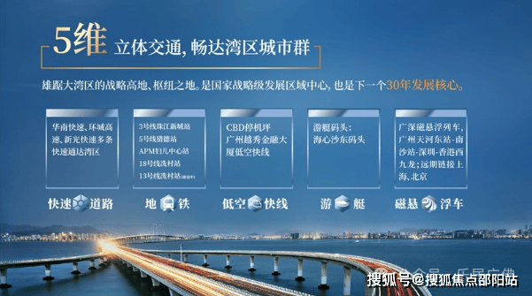 【全维交通·畅达大湾区】低空快线:CBD停机坪(广州越秀金融大厦低空快线)轨道交通:3号线、5号线、APM线、18号线、13号线(建设中)广深磁悬浮(规划中)快速路:华南快速、环城高速、新光快速多条快速通达湾区游艇码头:海心沙东码头(可停靠游艇半小时)