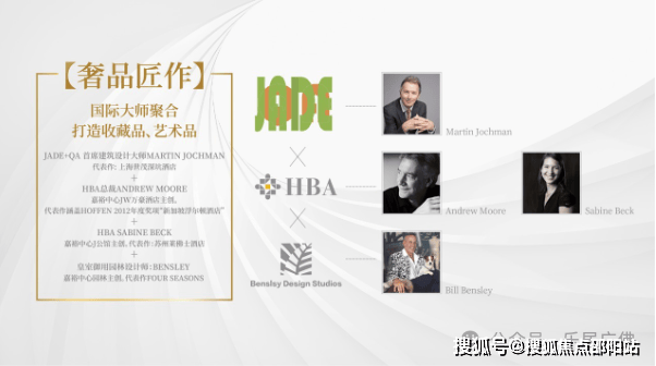 【大师聚合·缔造顶级城市收藏品】全球顶级建筑设计机构:JADE&QA(上海世茂深坑酒店、迪拜的 Jumeira Beach Hotel)全球顶级室内设计机构:HBA设计(苏州莱佛士酒店、成都费尔蒙酒店、河内洲际酒店、印尼洲际酒店等超是个五星级酒店设计)