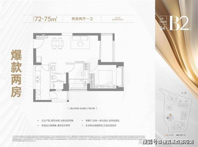 72-75㎡两房:格局方正,动静分区,主卧带飘窗,适合刚需首置家庭。