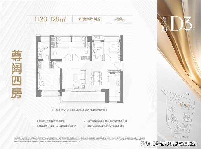 123-128㎡四房:南北通透,双阳台设计,主卧套房带衣帽间,适合改善型家庭。