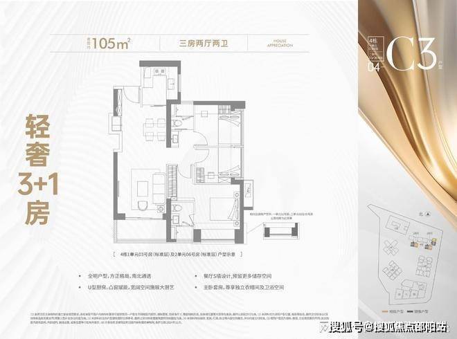 104-108㎡三房两卫:横厅布局,阳台开间达 6 米,空间通透,可改造成 “3+1” 房。