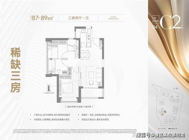 87-89㎡三房:竖厅设计,客餐厅一体化,部分户型含 1.5 卫,实用性突出。