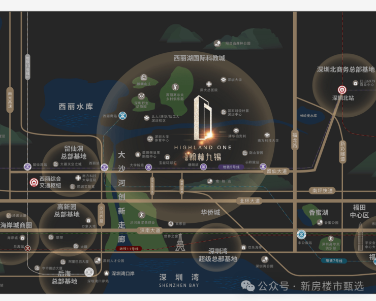 留仙大道正席,紧邻地铁5号线塘朗站,4/5/7号线3轨环绕,毗邻“三纵五横”主干道,瞬息通达全城。西丽高铁站(建设中)、深圳北站两大枢纽环绕,拥有世界交通能级。