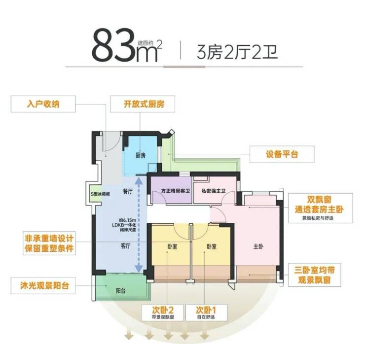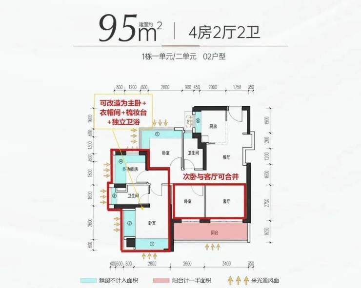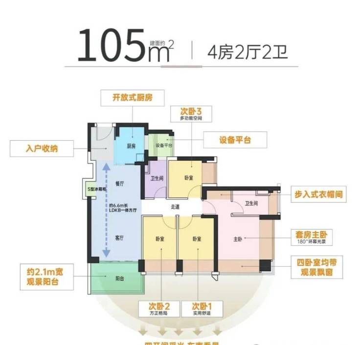 项目主推建面约72-105㎡的3-4房,根据户型测算,产品基本在98%使用率,最高实用率甚至能突破100%,相较于新规前普遍75%左右的得房率,堪称是“王炸”级别的存在!