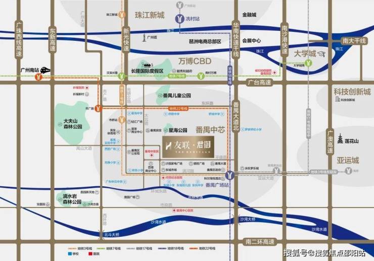 项目坐拥番禺TOD交通枢纽,地铁3号线、17号线(规划中)、18号线、22号线四轨接驳,湾区最快地铁18号线,时速可达160公里,一站直达天河,占位交通便捷之处,让工作与生活的切换更便利。
