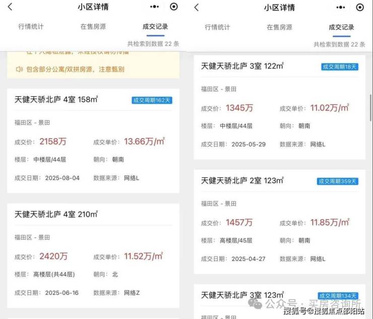 但天健天骄北庐就有点“拖后腿”,2019年8月29日,天健天骄南苑开盘,推出515套90-171㎡住宅,开盘当天售出414套,去化率80%。2020年11月28日,天健天骄北庐开盘,推出207套122-266㎡住宅,备案价11.76万,约4小时售罄。2022年6月,天健天骄西筑开盘,去化约9成。当时开盘价格约为11.4万元/平方米。2025年8月二手房最低价去到了11.52万/㎡,最高价13.66万,主要是同片区新盘竞争太激烈。加上片区随然说靠近香蜜湖但毕竟是属于景田片区,再就是学区没有香蜜湖优质,带的是荔园外国语小学(天骄校区)➕红岭教育集团科技中学。相比上面深业中城不管是地段还是学区都是有所差距的