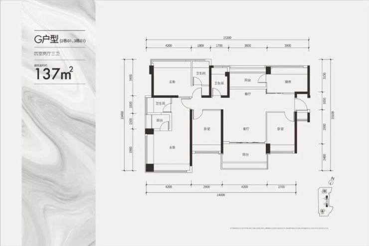 建面约137㎡双套间户型(四房三卫)