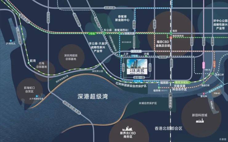 【立体交通 海陆畅达】双地铁线:7号线双地铁口优势;22号线双地铁上沙交汇站(规划中),1站直达香蜜湖新金融中心与河套深港创新合作区。·超级口岸:皇岗口岸深度改造,深港唯一24小时陆路通关口岸,3城轨+2地铁,迅捷连通深港河套两地。·联港通沪:沪深高速磁悬浮规划,约2.5h通达沪深,链接“上广深港”南中国超级都会群。·城际轨道:全面覆盖广深科技创新走廊的穗莞深城际铁路,贯通大湾区重要科技核芯;深广中轴城际铁路,直连广深城市中心;香港北环支线,再添深港连通新轨道,便利畅达尖沙咀。