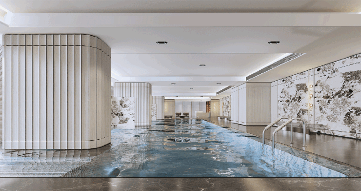 项目还舍弃商业面积,打造了室内泳池、健身房、瑜伽房等设施。比如精致奢靡的无边际泳池,亦有天然奢石背景墙等标配,尊贵惬意的健康生活随意切换,直接对标珠江新城级别。