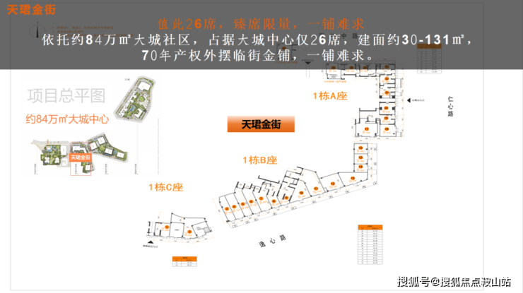 依托约84万㎡大城社区,占据大城中心仅26席,建面约30-131㎡,70年产权外摆临街金铺,一铺难求。