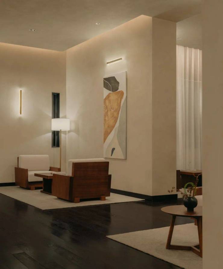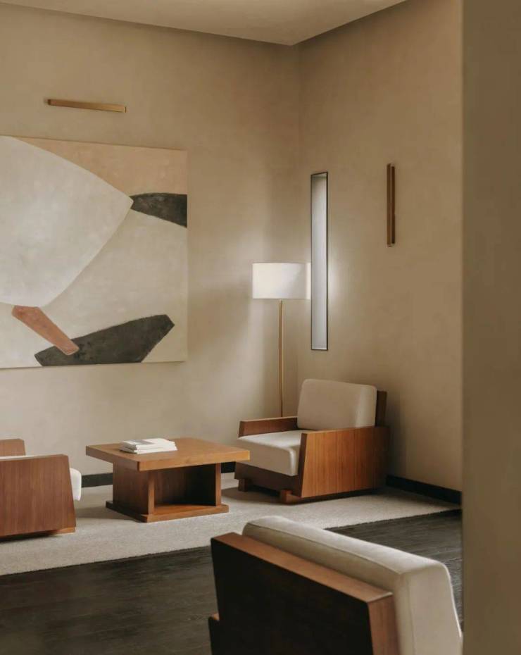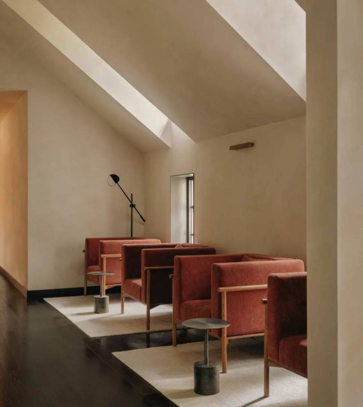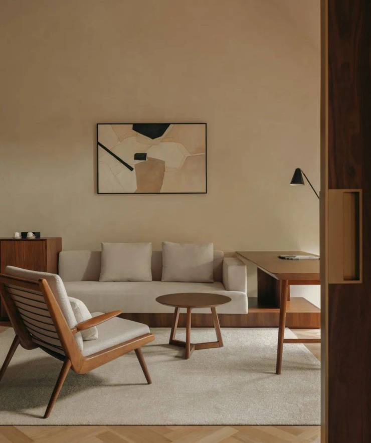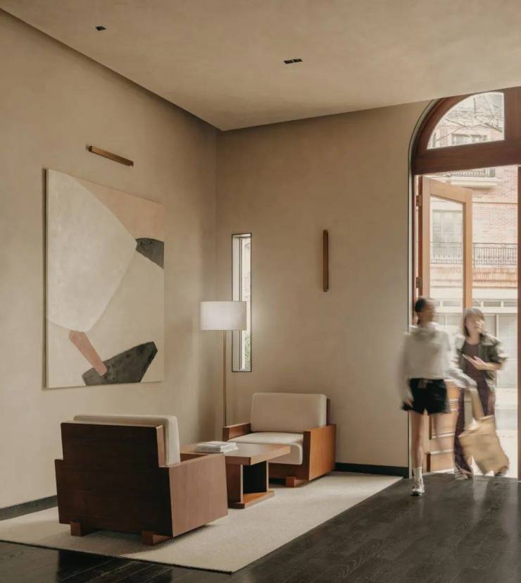 本次改造采用可持续策略,以延长空间的使用生命周期为原则,室内简约、尽可能去冗的信息素,为空间增加保鲜。酒店原有木质大门进行保留,装饰材料采用环保涂料,天然材料,减少工业化材料使用,从环保和循环使用方面进行优化。酒店大堂分区休息座椅的小尺度亲和设计不仅为旅客营造慢下来的氛围空间,也通过合理分流帮助提升运营效率。空间的包容性则体现在对时空环境的尊重,对未来空间使用的包容,对空间原有基因和未来可承载的感知的设计接纳之中。