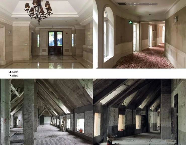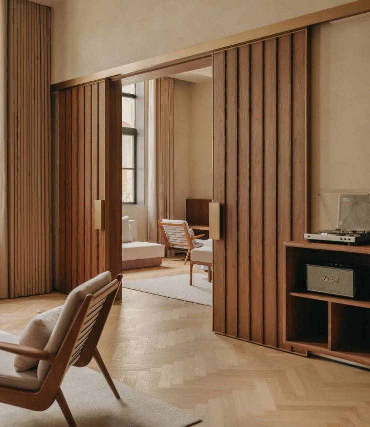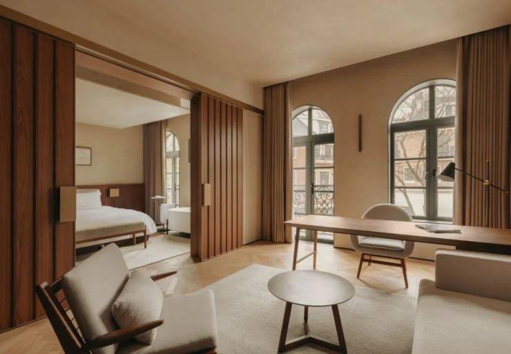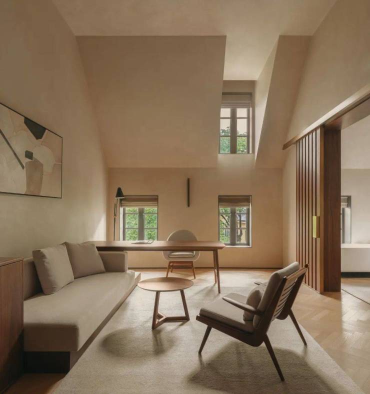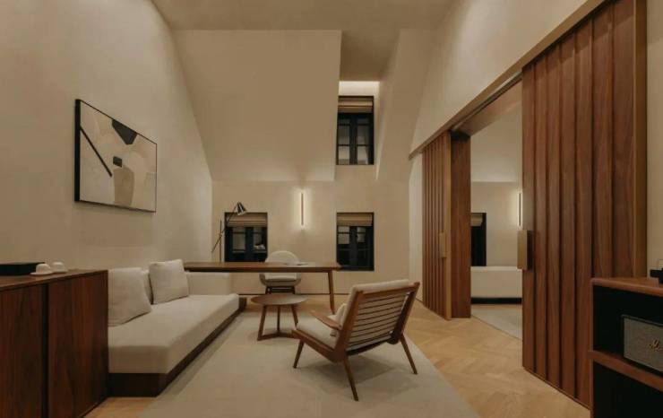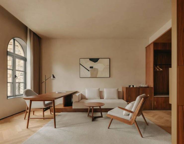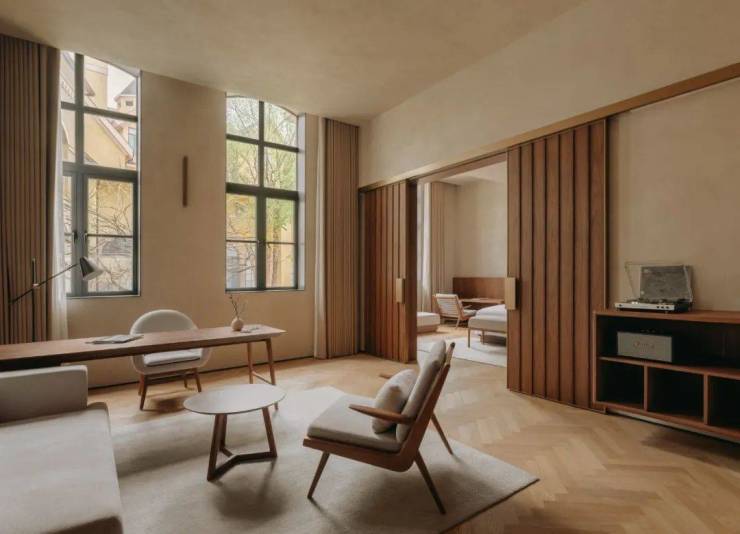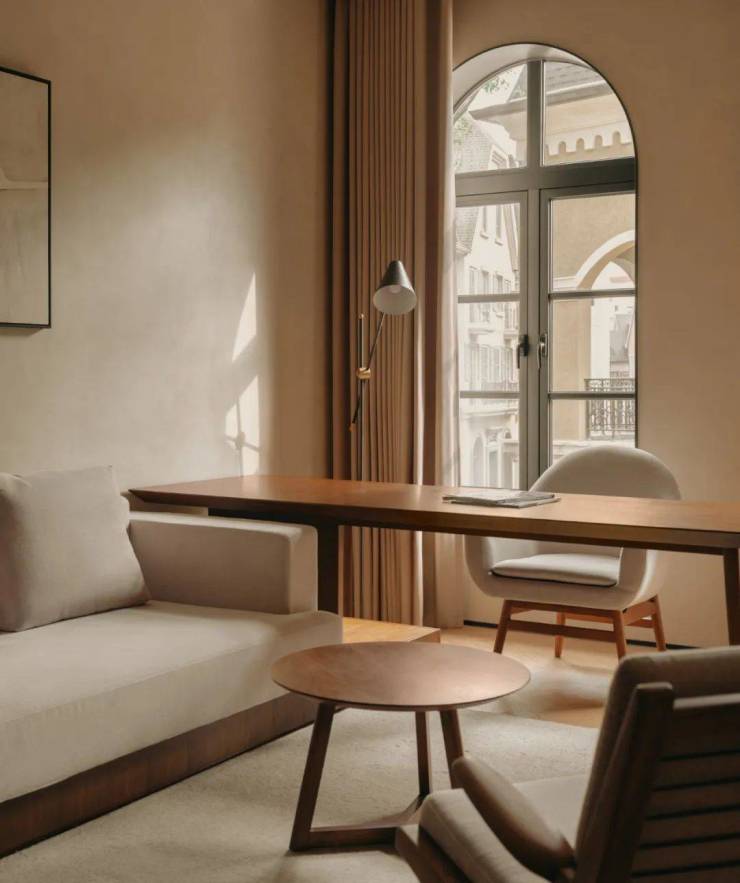 酒店所在小镇街区具有丰富业态,复杂空间,多样建筑,和充满活力的度假社区氛围。建筑原本标志性的欧式基因使得室内持留存时间的空间改造策略。设计将原有内装全面拆除,露出空间原本的朴质,保留其简洁纯粹的原始结构,延续原有布局全套房的形式。将原建筑立面的暖色调延续进室内的色彩呈现,提炼立面的凹凸窗墙元素延申到室内的凹凸触感肌理,以木质家具和特别选取的具有时间感的旧质材料,表达时间的深度。