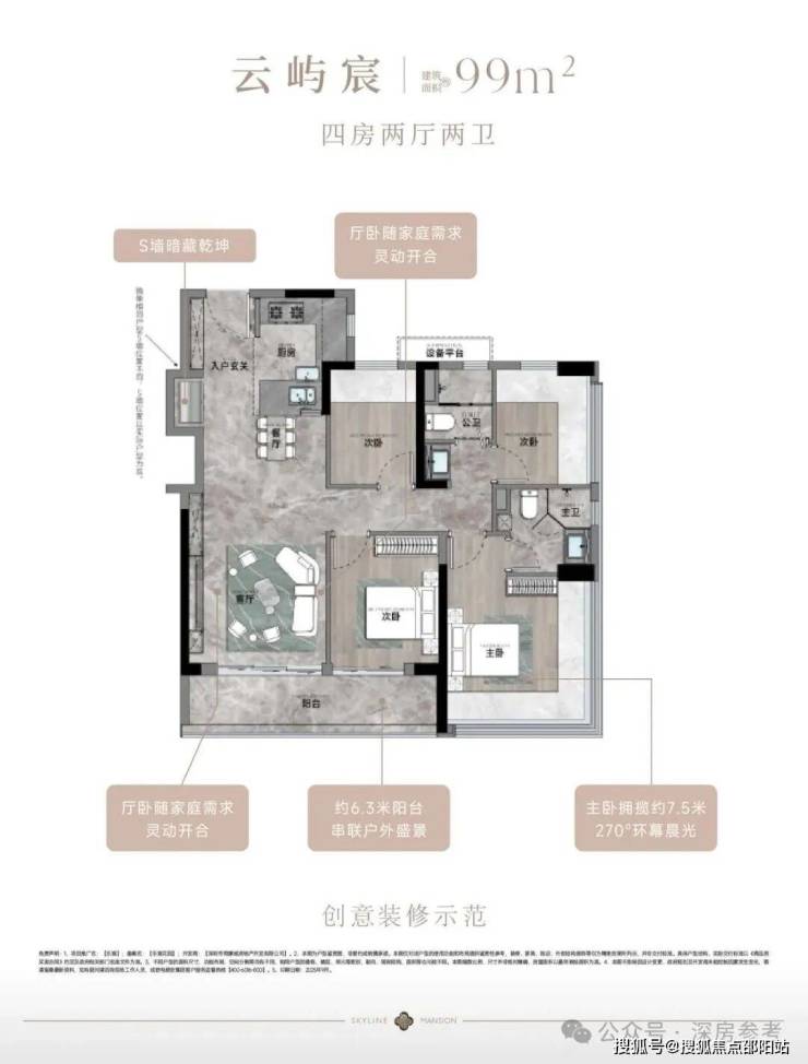 ✅ 99㎡4房2卫为项目主力户型,折后总价362-388万/套,单价3.63-3.89万/㎡,竖厅格局,LDKB一体化,三开间朝南,客厅连接次卧出9.37㎡大阳台,赠送设备平台,房源充足;