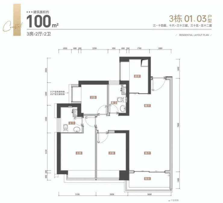 3栋:4梯6户,层高3.1米,01-04户型100平3房2卫,05-06户型120平4房2卫