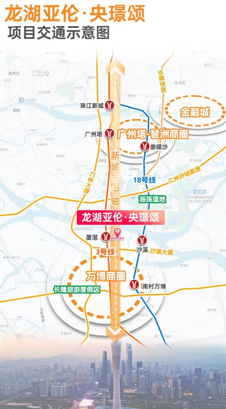 项目坐落在番禺沙溪,紧邻地铁18号线沙溪站(约600-700米)和3号线厦滘站(约1公里),可快速通达万博、琶洲、珠江新城等核心区域。