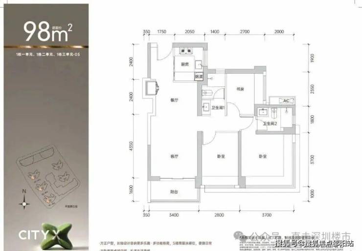 98㎡的3房2厅2卫,1栋1/2/3单元03.05户型/3栋的98平户型,设计的是经典竖厅格局,进门入户玄关,客厅3.4米开间,LDKB一体化,S墙设计预留冰箱卡槽位,三开间朝南,动静分区,3个卧室分别做到了主卧14.3㎡/次卧10.36㎡/次卧6.75㎡(包含墙体飘窗),U型厨房,公卫三段式分离,得房率约74.6-75.4%(不含赠送),东南或西南朝向。套内面积74.09㎡+赠送面积11.13㎡=实得85.22㎡,加上赠送后得房率约86.96%。