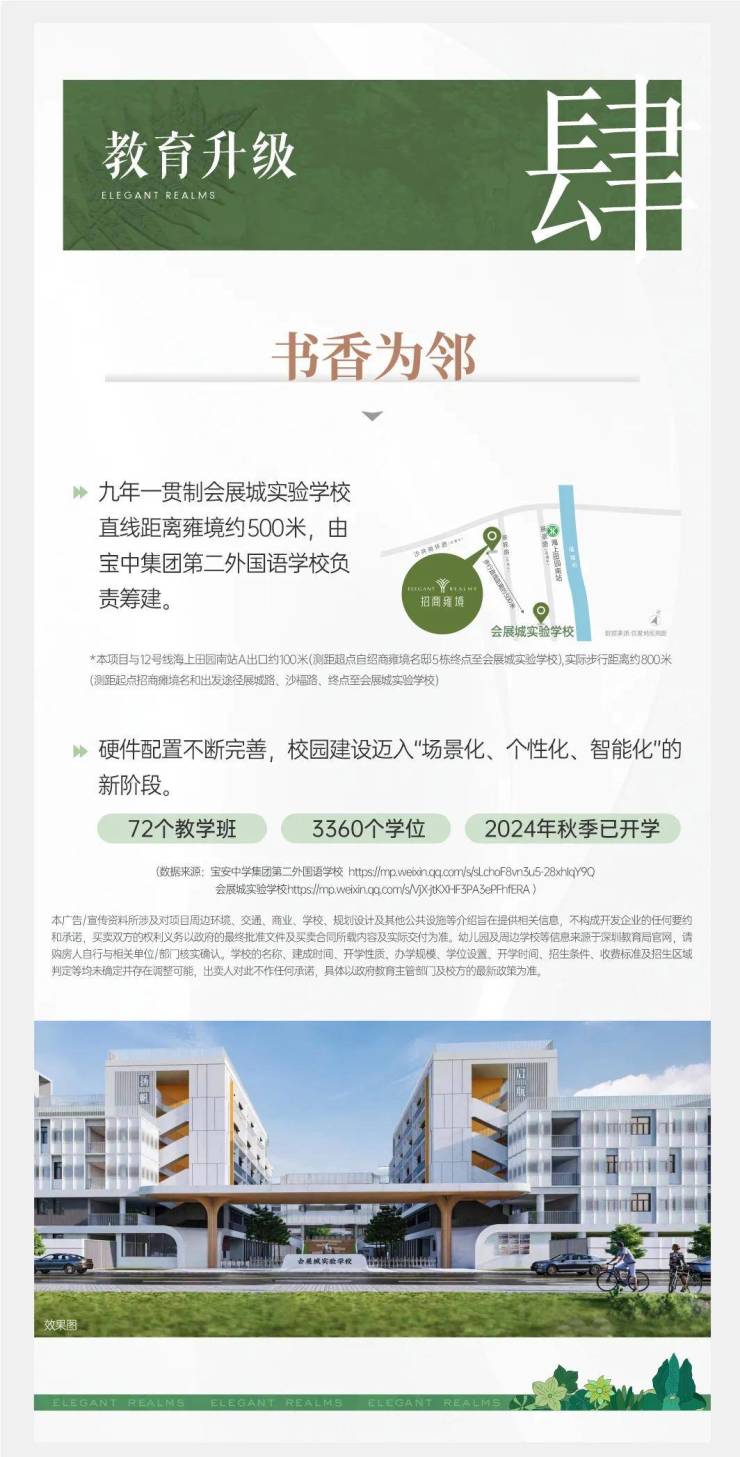 项目自带有1所9班制幼儿园,南侧约400米有会展湾实验学校,九年一贯制,72个班,3360个学位,由宝安中学(集团)第二外国语学校打造,去年9月份首次招生(小一录取积分96.8分,初一录取积分89.2分)。