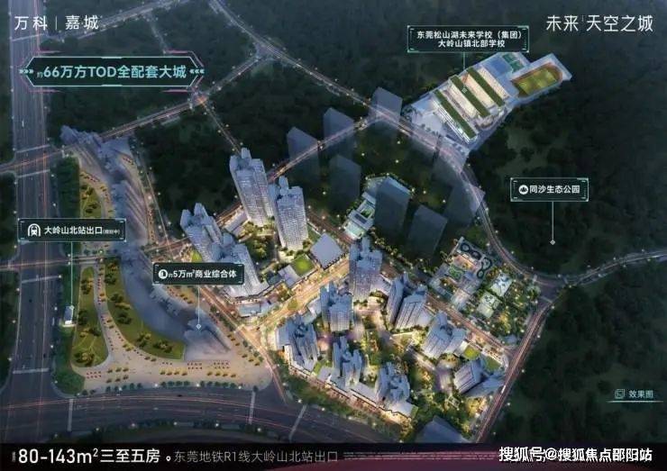 大岭山新盘万科嘉城·未来天空之城项目位于大岭山北站TOD,规划约66万平的体量,打造一座能代表城市的TOD未来超级生活大城。在项目旁边,是东莞松山湖未来学校教育集团成员之一的大岭山镇北部学校,据悉,该学校为公立小学,由未来天空之城项目配建。