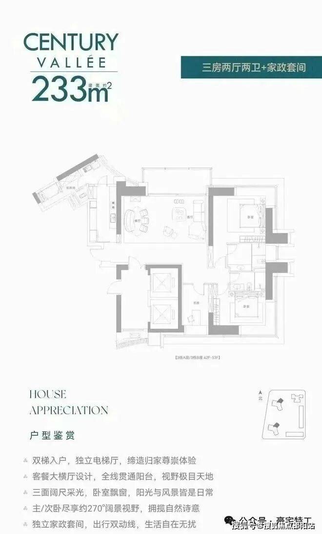 【约233㎡3+1房3卫】双梯入户,独立电梯厅,餐客大横厅贯通阳台,三面采光,主次卧尽享270°环幕视野,还有独立家政套间,西北朝向看名商和沙河高尔夫