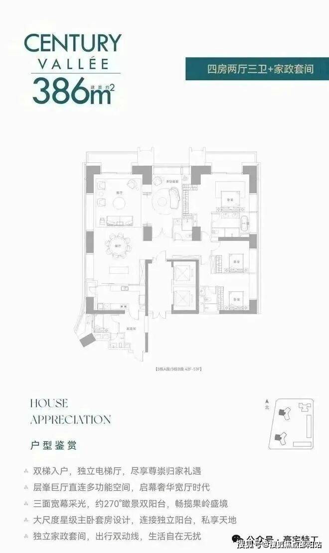 【约386㎡4+1房4卫】双梯入户,独立电梯厅,阔绰横厅直连多功能空间,三面舒适采光,主次卧双套房,270°环幕视野,还有独立家政套间,西朝向看名商高尔夫和大河沙生态长廊。