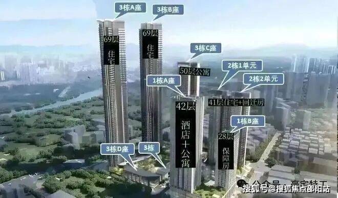 总栋数:8栋(1A栋42层酒店+公寓、1B栋28层保障房,2栋1/2单元41层住宅,3A/3B栋69层住宅;3C栋50层公寓、3D栋4层公寓)