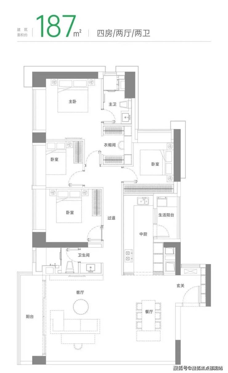 本户型不多,只有99套,总体和118平格局类似,每个区域稍微大一点点,生活阳台拓进厨房会让厨房更大一点。
