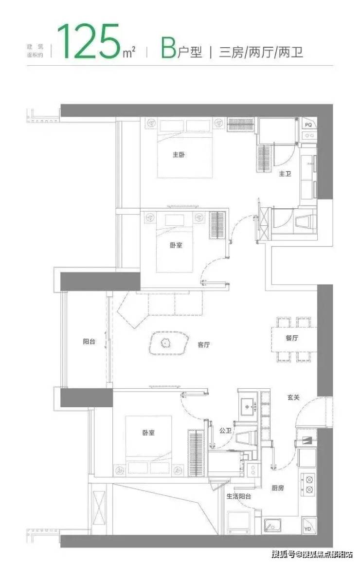 ③ 125㎡3房2卫:809套(A户型646套+B户型99套+C户型64套)