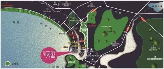 整个项目周边山水环绕,呈四水归堂,五岳朝贡的上山上水格局。利于藏风聚气,人财两旺。并借力三亚湾,水流平缓,弯曲以聚财。所谓“河流入海口,财富聚集地”,因此被三亚市民评价为风水最好的地方,正如三亚民间所说“青龙盘踞旺宅地,白虎俯视南海门”。