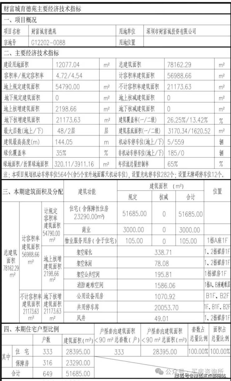 总规划649户(其中商品房333户,保障房316户),其中商品房户型套内建筑面积<90㎡的有333户,机动停车位564个,非机动停车位185个