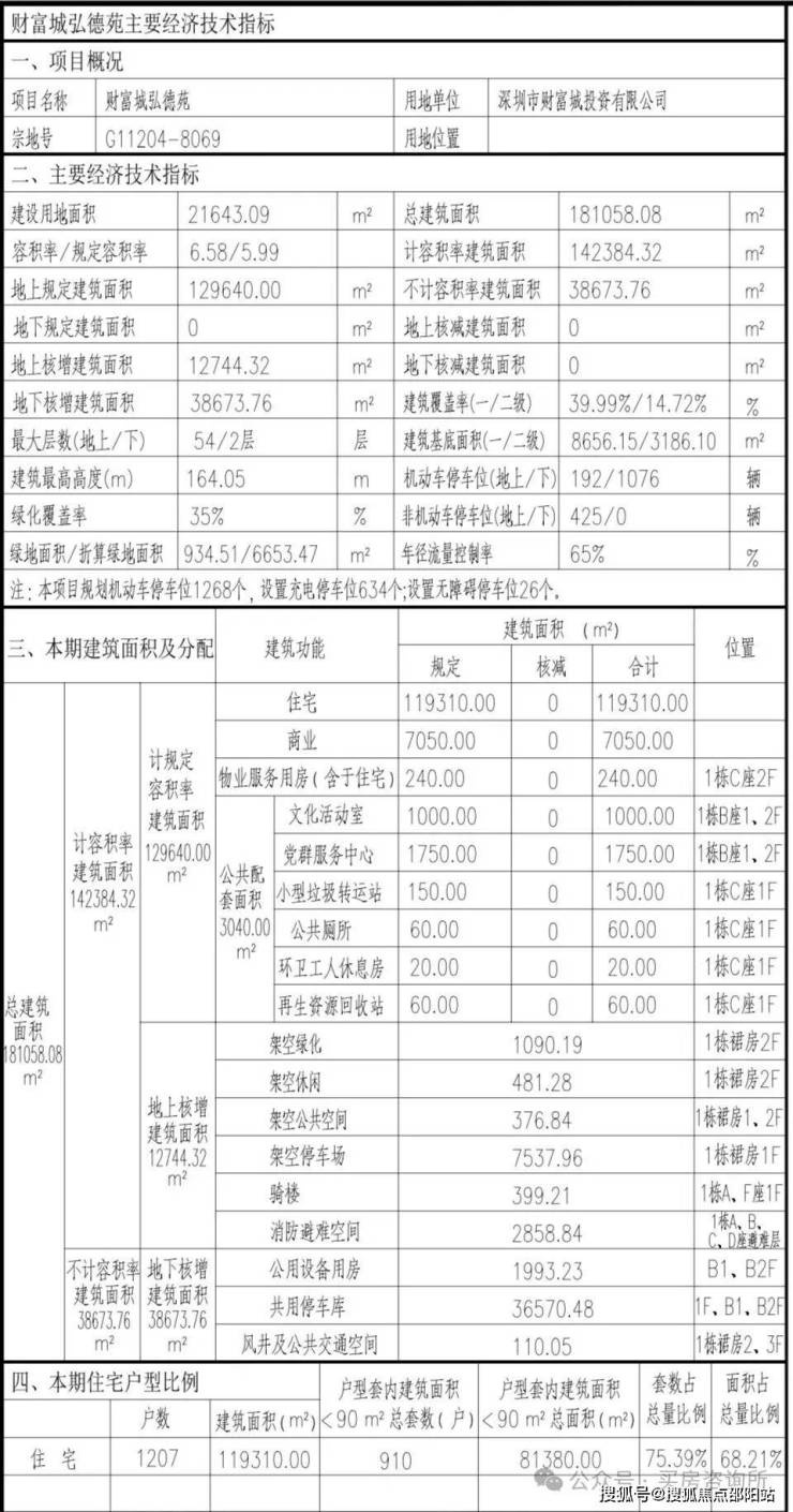 财富城弘德苑:占地面积约2.16万㎡,总建筑面积约18万㎡,计容建筑面积约14.2万㎡,容积率6.58,绿化率35%,共由1栋6座住宅组成,其中1栋A座住宅52F,1栋B/C/D座住宅54F,1栋E/F座住宅32F