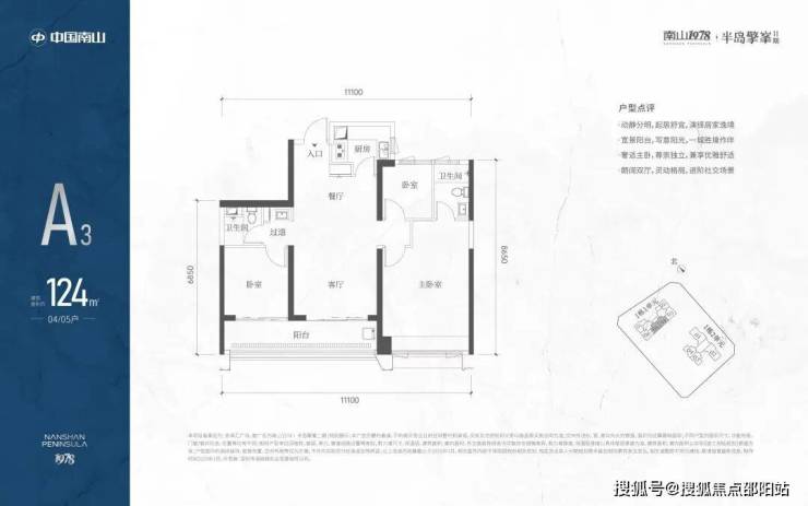 A3也是两条腿,分别是1-1栋04/05,主朝向是东南向,双龙抱珠格局。客厅拥有超大观景阳台,缺点是公卫是个暗卫,小次卧和主卫也对天井外走廊,采光不足。