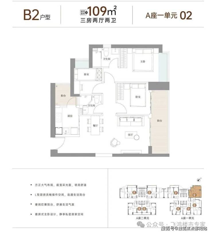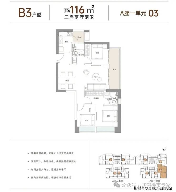 设计的是竖厅双龙抱珠格局,客厅3.2米开间,三开间朝南,一字型厨房,还带1个生活阳台,卫生间三段式分离设计,阳台东南朝向。户型