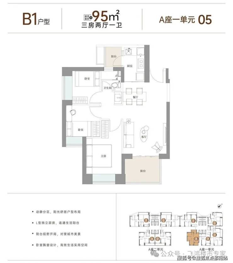 设计的是竖厅格局,客厅3.4米开间,LDKB一体化,动静分区,L型厨房,带1个生活阳台,卫生间三段式分离设计,阳台东南朝向。户型