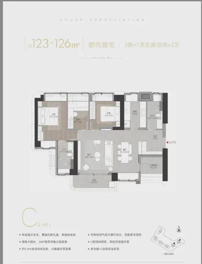 从面积而言,目前改善型一般需要在约120平米以上,所以我们首先来看建面约125平的A户型,住宅性质,非常好用的3房+1多功能空间+2卫。