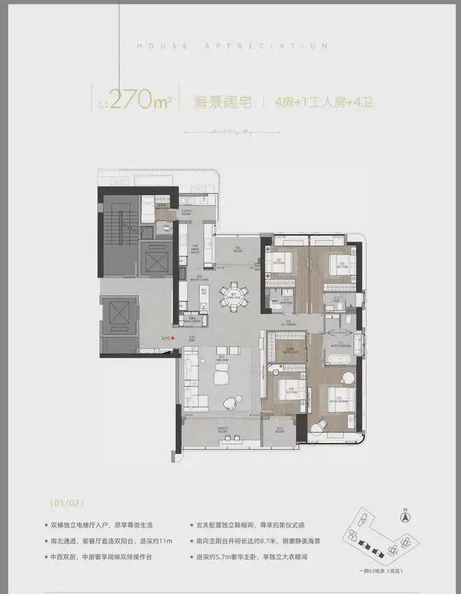 相比建面约253平的户型,建面约270平的户型更加舒适。尤其是客厅的尺度感很强,做出了大宽厅的设计,客厅开间达到约6米,尺度非常奢适。