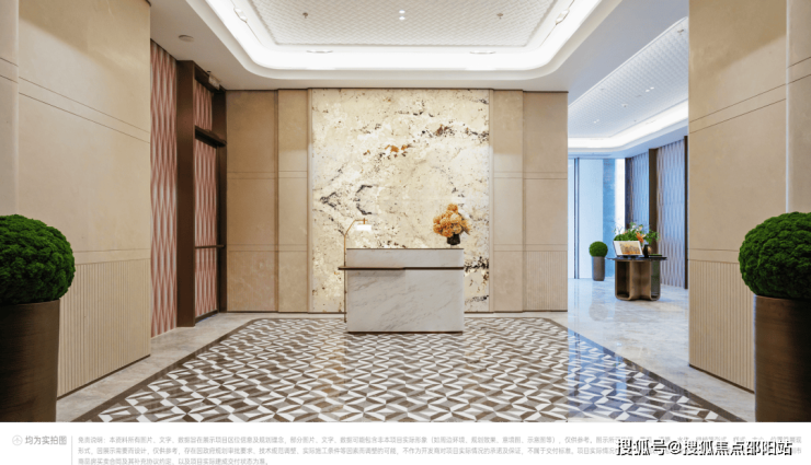 造型对称的东方府邸大门,两侧还有造型罗汉松以及园林小景,整体在香槟金金属线条的勾勒下,既显柔和璀璨、又不失精致考究。