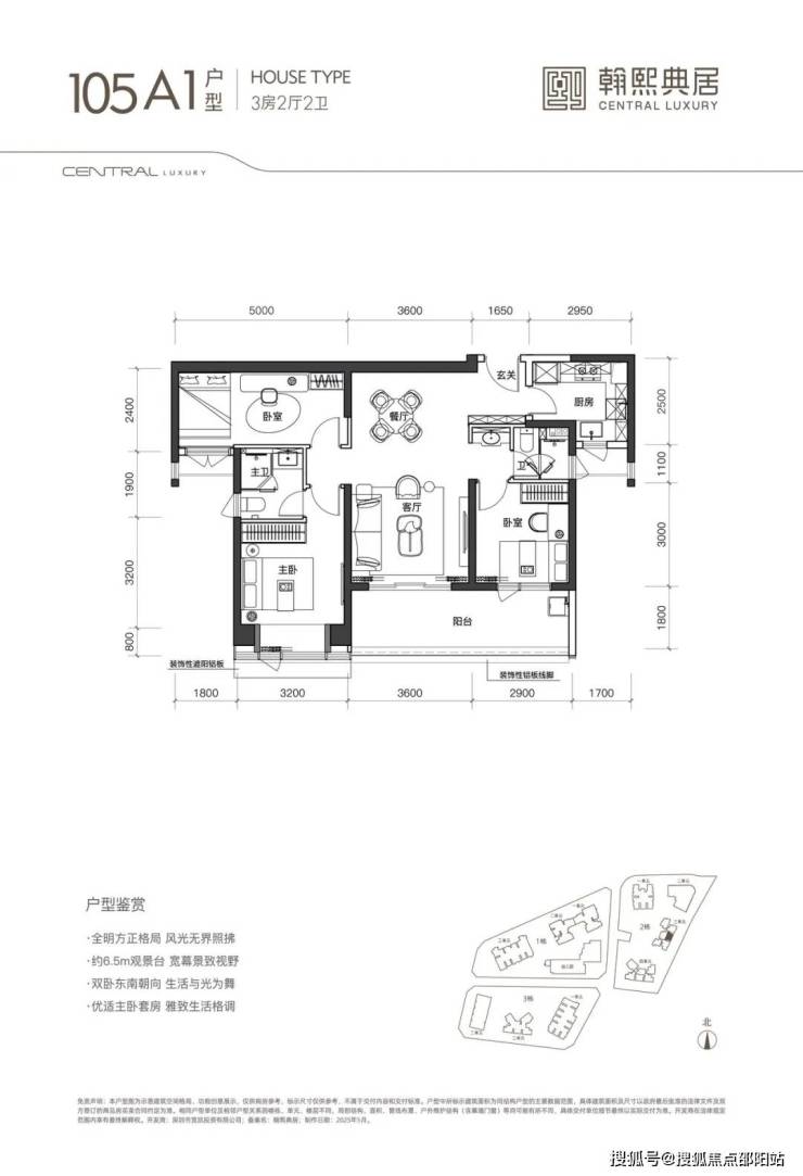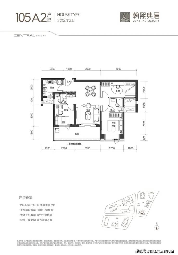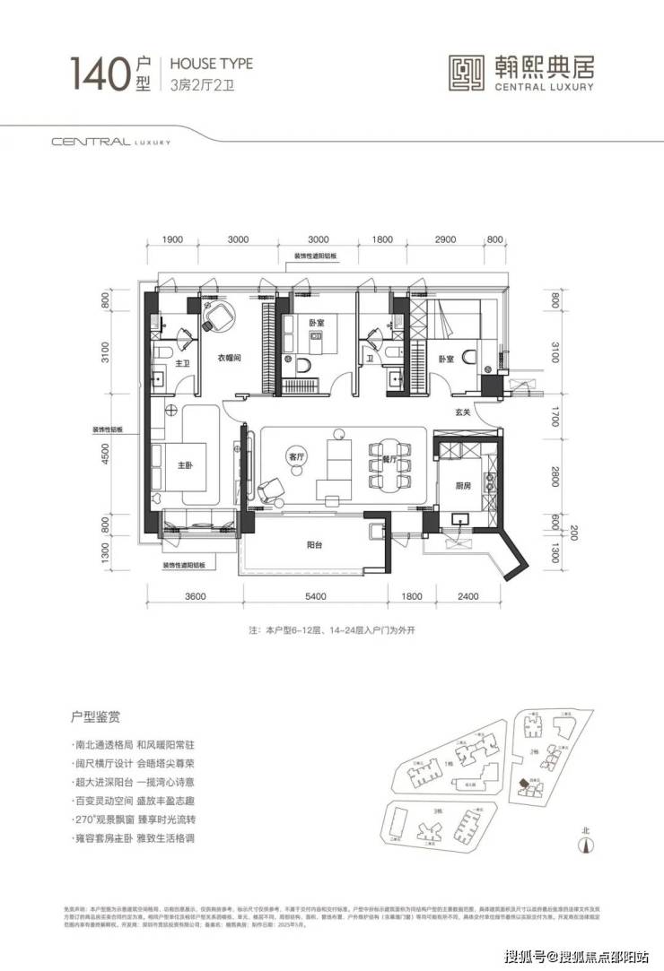 该户型为 02 地块的唯一一条腿,非常稀缺。户型南北通透,带大主卧套房的奢居型三房。带 5.4m 观景台,大横厅奢阔空间设计,主卧同客厅阳台、餐厅三面宽朝西南。北向双次卧、双卫生间、拓展空间共五面宽一字排开,视野全面俯瞰社区内园林,静谧舒适。