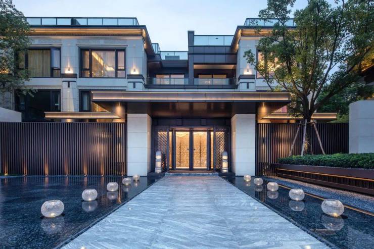 建筑风格方面,项目采用新中式建筑风格,将传统京城院落大宅礼序与空间的别墅式立体化演绎,重现东方院落文化精粹。同时,项目在细节处理上也极为考究,如252颗铜制鎏金“浮沤钉”的门宅设计,以及采用法国金花干挂天然石材的重达上吨的镇宅石狮,都彰显了项目的尊贵与不凡。