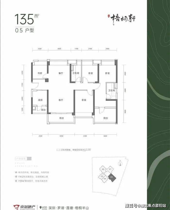 05户型建面约135㎡的5房2厅2卫,竖厅南北通透格局,客厅4.2米开间,客厅阳台主朝西南朝向。