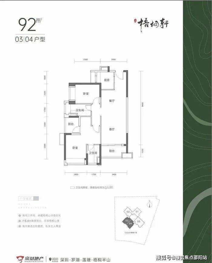 03\04户型92㎡3房2厅2卫,竖厅格局,客厅3.4米开间,西南朝向。