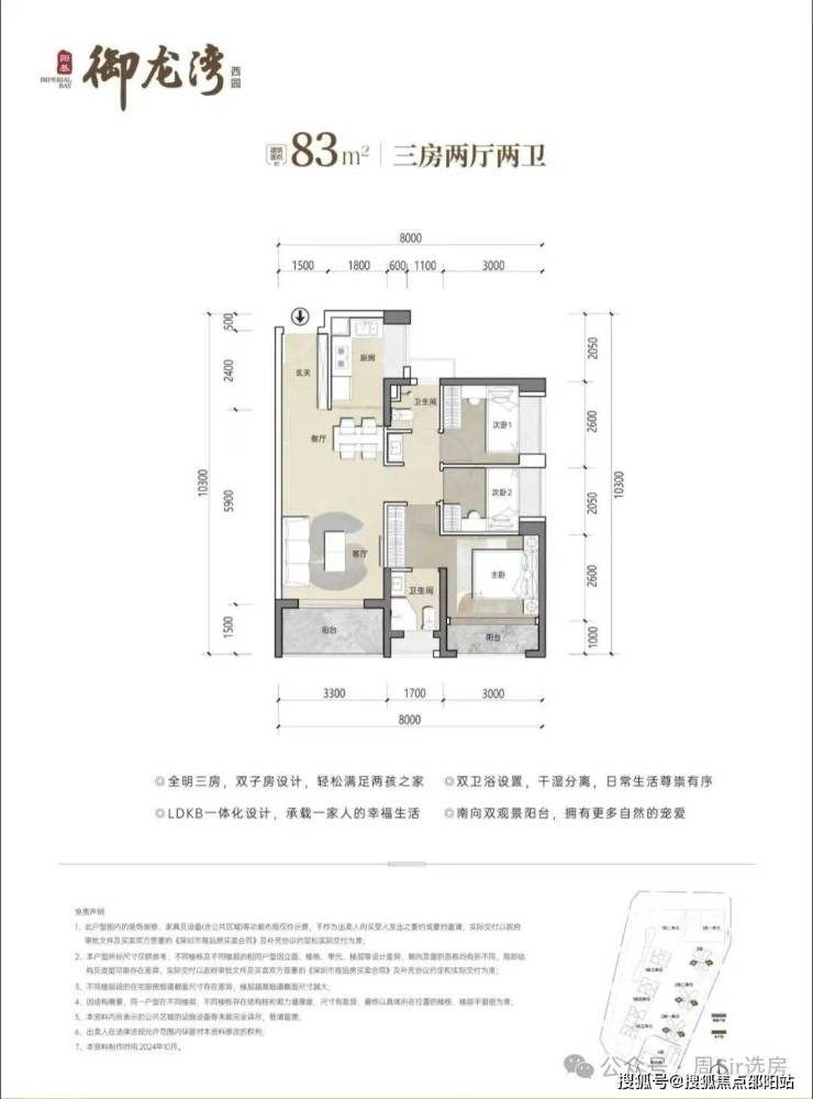 83㎡3房2卫,分布在2栋2单元03/04户型,设计的是竖厅格局,客厅开间3.3米,LDKB一体化设计,三开间朝南,U型厨房,公卫三段式分离设计,得房率约79.25%(不含赠送),东南或西南朝向,加上赠送得房率约89%。
